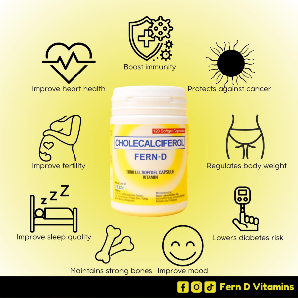FERN-D is a brand name for a vitamin D3 supplement containing cholecalciferol, used to support various bodily functions including muscle, bone, and immune health.; It is a dietary supplement available in softgel form, often in bottles of 60 or 120 capsules, sold under the brand name FERN.; The supplement is marketed as a way to get vitamin D even without sufficient sun exposure.; Product detailsActive ingredient: Cholecalciferol (Vitamin D3)Form: Softgel capsulesBrand: FERNPurpose: Supports muscle, skeletal, and immune systems, and heart healthAvailability: Sold in various quantities, such as 60 or 120 capsules per bottle Usage and considerationsDaily use: The product is intended for daily use.; Supplementation: It is a good option for individuals who may not get enough vitamin D from sun exposure.; Timing: Some sources suggest that taking vitamin D close to bedtime might affect melatonin levels, so be mindful of timing.; Specific health conditions: Individuals with certain health issues, such as lymphoma, kidney disease, or sarcoidosis, should use vitamin D cautiously and monitor their calcium levels, as it may increase calcium levels in some case