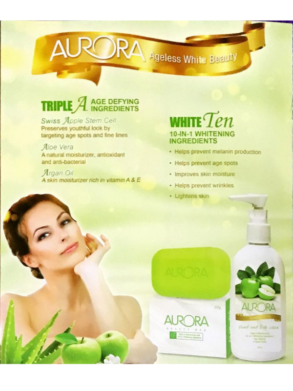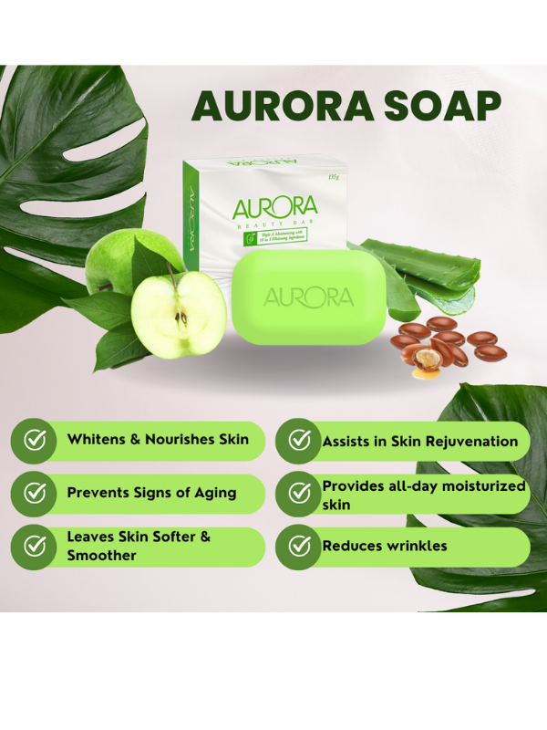 Aurora Beauty Bar: Advanced Skin Brightening & Anti-Aging SoapReveal your skin’s natural glow with Aurora Beauty Bar, a premium anti-aging and whitening soap infused with Triple-A Age Defying Ingredients: Argan Oil, Swiss Apple Stem Cell, and Aloe Vera.; Enhanced with White-Ten®, a patented brightening complex, this luxurious beauty soap deeply nourishes, hydrates, and evens out skin tone for a radiant, youthful glow.