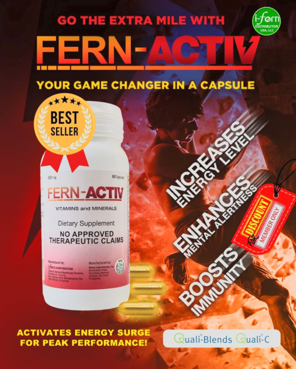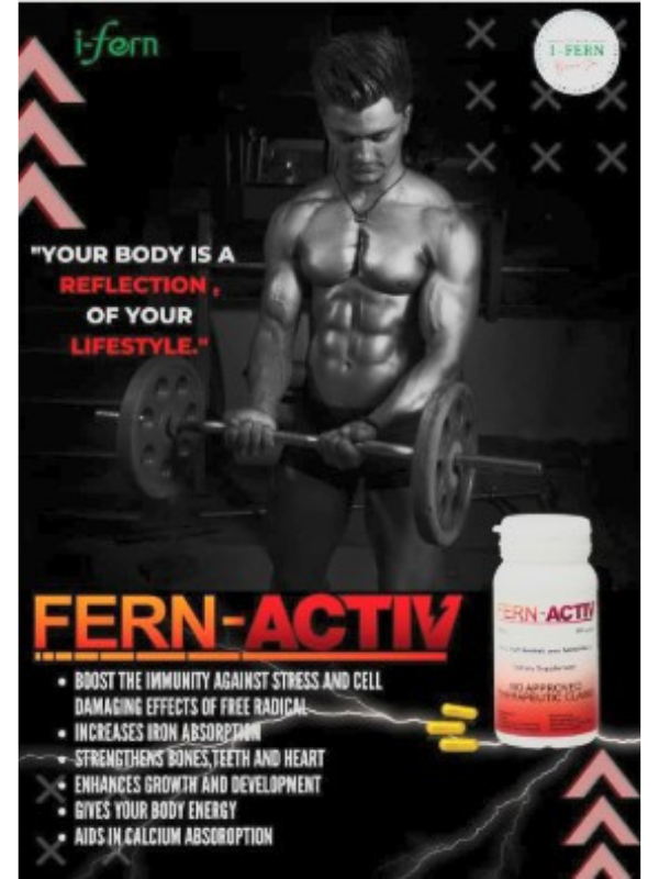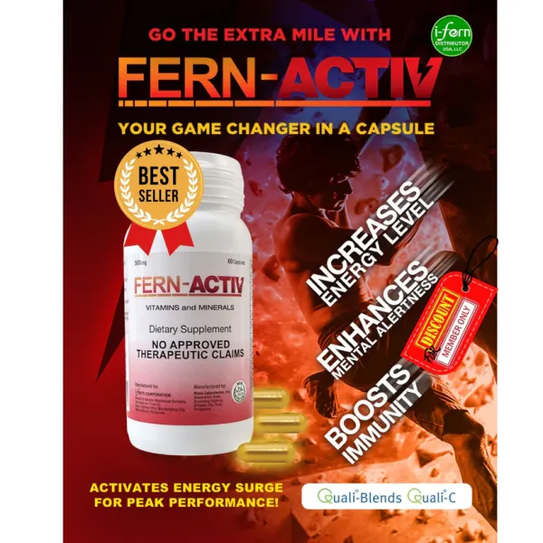 FERN-ACTIV 60 Capsules, the perfect supplement to support your active lifestyle.; Packed with essential B-Vitamins, this formula provides the energy surge needed for peak performance.; Not only does it contain non-acidic vitamin C for improved immunity, but it also includes Zinc for added energy, Vitamin D for stronger muscles, and Calcium for healthy bones.; With 8 essential vitamins and minerals, FERN-ACTIV boosts the immune system, enhances mental alertness, and supports overall well-being.; Take control of your health and wellness with FERN-ACTIV, containing Calcium, Zinc, B6, B2 and more.; Kickstart your day the right way and experience the difference with FERN-ACTIV!MIMS Registered